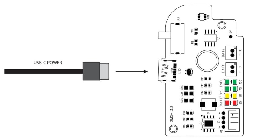 Connect the Power Board to a USB-C power supply and ensure you see three solid battery level LEDs and one flashing battery level LED