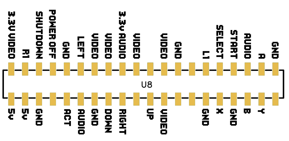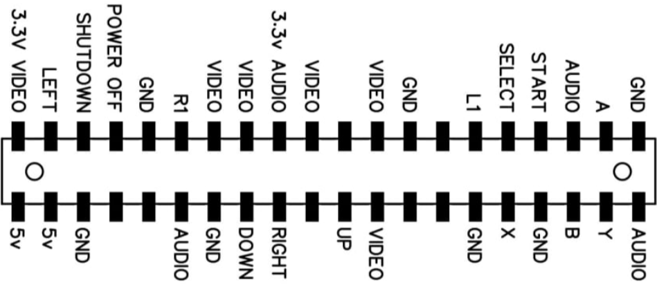 All GPIO pins currently used on the Zega Mame Boy Mainboard (2.7). Any pin not labelled can be considered 'Spare'. Check the official Raspberry Pi documentation for a detailed description of each Pin