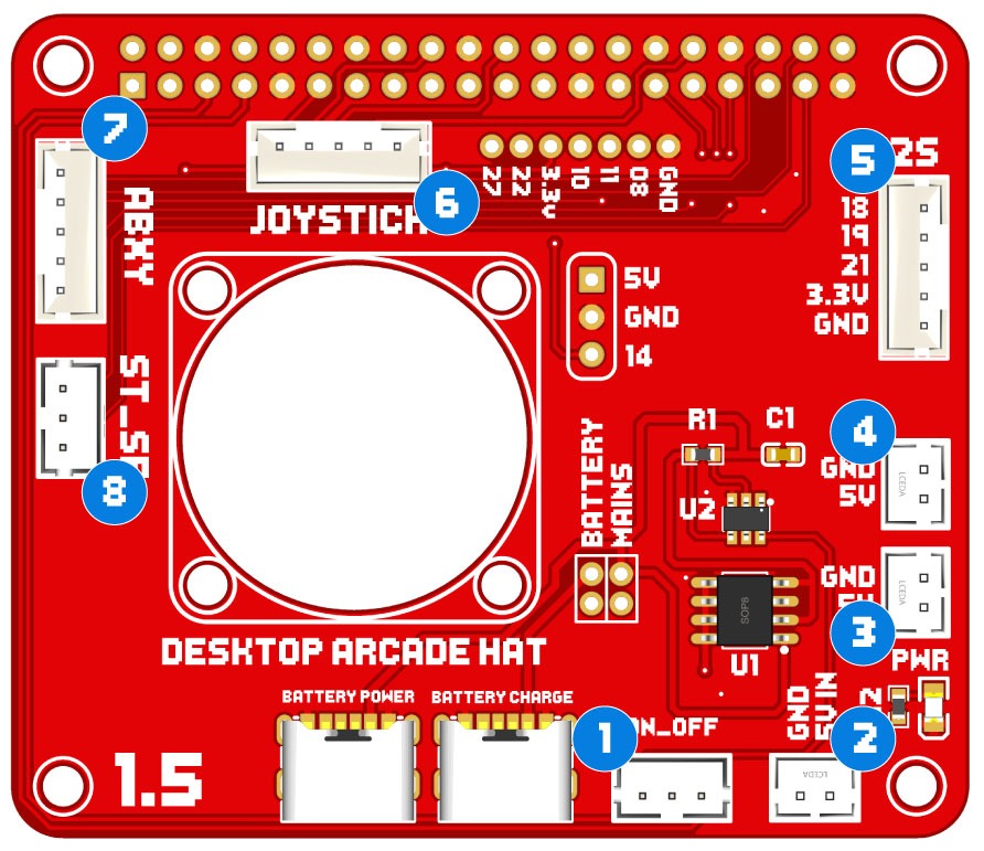 The Desktop Arcade Hat plugs into the 40 pin header of your Raspberry Pi using the supplied 40 pin header block and provides easy access to all of the required Raspberry Pi outputs needed to run your Desktop Arcade.